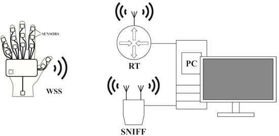 Figure 2 presents the station for the analysis of network traffic generated by the WSS. Like in the case of the stations I and II, the RT allows for the registration of only data frames (Ethernet), whereas the network traffic is monitored in a wider range via the sniffer–ALFA AWUS036ACH AC1200. The sniffer connected to the PC server via the USB port was used to receive Wi-Fi frames. The measuring station makes it possible to monitor the simulated load on the radio network with a different amount of transmitted data, which is described in more detail in Section 4.