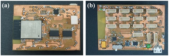 The developed sensor system for hand motion acquisition is presented in the form of a block diagram in Figure 3. Hand motion acquisition with the use of inertial sensors is related to the implementation of such a system in a wearable form. The solution presented in the article consists of a central module (MAIN), to which sixteen LSM9DS1 sensors [] (S1 to S16) are connected via the SPI (Serial Peripheral Interface) bus (SPI BUS). Each of the sensors has a built-in accelerometer, gyroscope, and magnetometer. The sensor system is powered by a 3.7 V lithium polymer battery (1 s). The battery is connected to the CHARGE CONTROL system, which, while charging the battery, is powered from an external 5 V source connected to the CHARGE INPUT. The CHARGE CONTROL output is connected to the DC-DC CONVERTER input. The converter output voltage is 3.3 V and is used to power both the ESP32 module and the LSM9DS1 sensors. ESP32 [] is a single 2.4 GHz Wi-Fi-and-Bluetooth combo chip, which in the presented wearable solution downloads data from the LSM9DS1 sensors, processes the received data and transmits them to the computer. The main board of the central module (MAIN) is shown in Figure 4a,b.