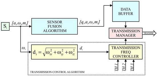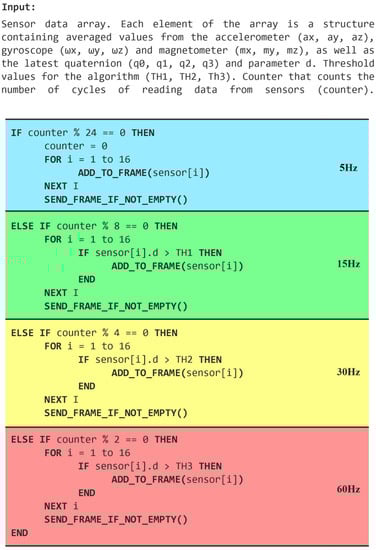 The wearable sensor system is also an embedded system with the implemented adaptive data transmission algorithm. The general structure of the WSS operation is presented in Figure 6, where the block of the radio transmission control algorithm is marked with a dashed line. This algorithm allows to increase the energy efficiency of the WSS and reduce the load on the sensor network. In turn, the input data of the algorithm are the vector  and the defined threshold values ,  and . In addition, the WSS operation diagram includes the processing of vectors , , and the quaternion , which is also indicated in the pseudocode in Figure 7. During operation, the ESP32 module collects data from Si sensors (i = 1, 2,…, 16). The sampling frequency of sensors in the implemented system for the accelerometer and the gyroscope is 119 Hz. The data obtained from each sensor are in the form of three vectors , ,  (1), where i = 1, 2, …, 16 denotes the indexing of the sensor number.