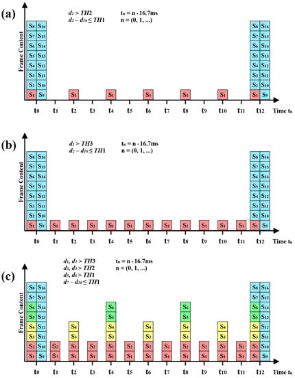 The individual threshold values TH were determined on the basis of preliminary analyses, which allowed for assigning the speed of motion to four ranges. The slowest movements are associated with a threshold below TH1, whereas the fastest with a threshold above TH3. Defining the threshold values TH is related to the dynamics of the monitored traffic. Theoretically, too low threshold values of the algorithm will increase the frequency of frame transmission even with slow movements. In this case, the effectiveness of network traffic reduction will decrease. On the other hand, too high threshold values will negatively affect the smoothness of motion mapping. When monitoring movements, the system will tend to transmit frames at lower frequencies, which may result in significant delays in movement mapping. In this case, only the most dynamic movements will activate the increase in frame transmission frequency, and therefore only they will be mapped without delays on the server side. The procedure for determining the threshold values is described in more detail in Section 4.3.3.