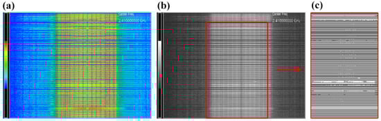 The network load status test was carried out both in terms of radio band occupancy and data transmission. During the performed tests, the WSS transmitted data in accordance with the previously developed measurement protocol. Measurements of radio band occupancy depending on the frame transmission frequency fT and the length of transmission frames were carried out using the measuring station presented in Figure 1. The spectrum analyser (SA) performed the measurements in the RTSA (Real-Time Spectrum Analyser) mode and displayed spectrograms. The measurements were performed in the frequency range from 2.39 GHz to 2.43 GHz. The WSS sensor module communicated with the RT access point using channel 1 (2.412 GHz). The acquisition time of one measurement was set to 24.996 ms. The measurement antenna directed at the WSS was 1 m away. The band occupancy tests, depending on the test case, were performed on the basis of the analysis of recorded spectrograms, where the X axis represents the frequency, and the Y axis represents the time. The Y axis consists of 483 points, with each point representing a single SA analyser measurement (24.996 ms). The signal strength measurement range represented by the spectrogram colours is from −100 dBm to 0 dBm. However, it was limited and ranged from −72 dBm to −27 dBm (Ref Hue Pos was set to 73 and Bottom Hue Pos to 28). Measurements were taken for all the test cases from P1 to P26 and, additionally, a measurement was performed with the sensor module turned off to determine the effect of ambient noise on the other measurements. The measurement results were saved as bitmaps presenting spectrograms. For the purposes of further analysis, the spectrogram colours were changed. The default colour range (Figure 9a) was converted to grayscale from the hexadecimal value range 0xFFFFFF (white) to 0x242424 (dark grey), where white is the highest measured signal strength (Figure 9b). From each image, the central part of the monitored band with a range of about 18 MHz was selected. Then, each image was thresholded with the values of 75, 100, 125, and 150 (from the range of 0–255, where 0 is black, 255 is white).