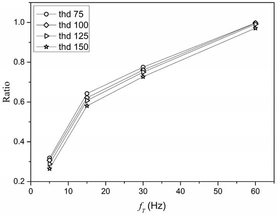 For each of the processed images (Figure 9c), the percentage of white was calculated, which represents the band occupancy. Regardless of the adopted threshold value, the share of white in the background image does not exceed 2.2%, so it can be concluded that the background noise did not have a significant impact on the measurement results. Figure 10 shows a graph of the percentage of white in the images as a function of the frequency fT, for various threshold values (thd).
