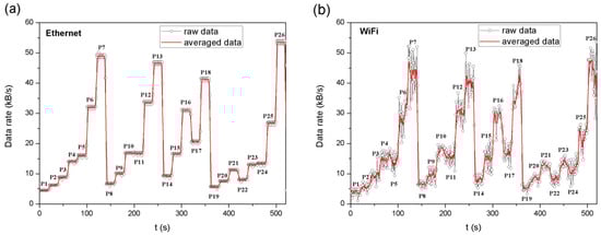 Changes in data rate for defined measurement cases: (a) for Ethernet frames and (b) for Wi-Fi frames.