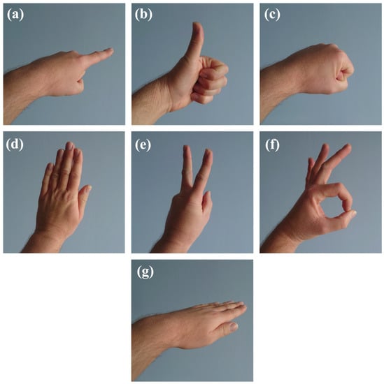 View of the hand when performing gestures: (a–f) defined measurement gestures and (g) control gesture.