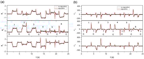 Examples of measurement signals (from complete data and after applying the algorithm) from one series of gestures, obtained from the accelerometer and the gyroscope, are presented in Figure 13a,b, respectively. The presence of subsequent gestures 1–6 (Figure 12a–f) and the control gesture C (Figure 12g), visible as a flattened signal between individual gestures (Figure 13), have been marked.