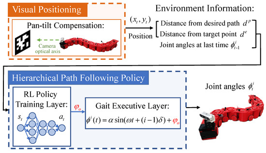 The overall architecture of the proposed control method is presented in Figure 1, which consists of two stages, namely the visual localization and hierarchical RL path following policy training. Specifically, for a n—link snake robot, at each timestep t, firstly, the pan-tilt compensate strategy proposed in [25] is adapted to provide the real-time position of a snake robot, which can be used to obtain the current system state; subsequently, the RL policy training layer outputs an action to modify the gait parameter of the gait equation based on the state, with the aim of changing the motion direction of the robot to make it close to the desired path. Finally, the gait execution layer sends the corresponding joint angles to the snake robot for executing the path following task.