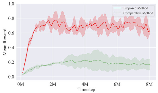 The simulation environment is developed based on the Mujoco [26] simulator, and the model of the snake robot is composed of nine connection modules with a pair of passive wheels and eight yaw joints. During training, the start point of the snake robot is . The desired paths are straight lines , sinusoidal curves , , , , and circles , respectively. The target point is a random point on the desired path with an x—coordinate . The end-to-end PPO algorithm, which takes the same state as the input and directly outputs joint angles, is selected as the comparative method to demonstrate the training efficiency and tracking performance of the proposed algorithm. Firstly, the comparison of the mean reward of an episode between the two methods is depicted in Figure 2.