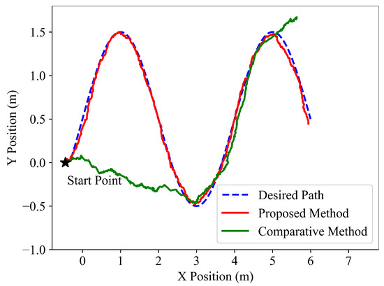 To verify the following performance of the learned policy, the path following tests are performed on three different types of desired paths, and the following results are shown in Figure 3, Figure 4 and Figure 5. It is indicated that the snake robot converges to the desired path agilely and accurately, and then it keeps following the path with small tracking errors driven by the proposed method, implying the superior path following ability of the hierarchical trained policy; in comparison, under the control of the end-to-end comparative method, the snake robot requires longer convergence time and presents larger tracking errors.
