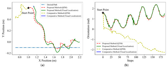 Firstly, to examine whether visual localization stabilization term improves the localization accuracy by reducing head swings, we compare the accuracy of the visual localization for the trained policies with and without the stabilization item , and the comparative results are depicted in Figure 6. To intuitively present the accuracy of the visual localization, the position and orientation results obtained by visual localization are compared with the results of the motion capture system Qualisys Track Manager (QTM). The desired path is , the start point of the snake robot is (1.0 m, 0.6 m), and the initial orientation is .