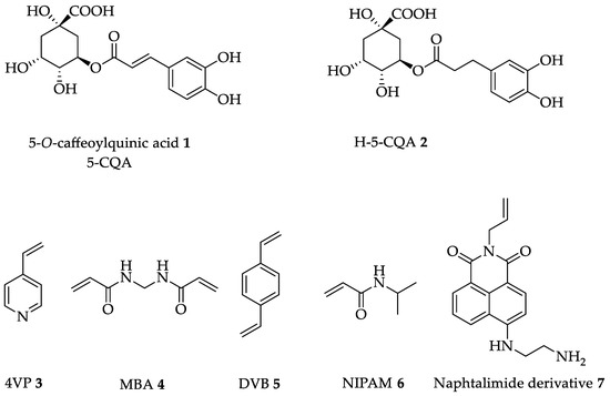 To achieve polymers suitable for the selective identification of the analyte, it is necessary to preliminarily evaluate the interactions between the analyte and the monomers in order to establish which are the best monomers to be used. Interactions can be observed by 1H-NMR titrations and the specific functionalities that are involved in the formation of the functional monomer–template complex before polymerization. It is known that the degree of template–monomer complexation is directly dependent upon the types of interactions employed and the chemical composition of the polymerization reaction mixture [20]. 4-Vinylpyridine (4VP) has already been used as a functional monomer for interactions with 5-CQA and is one of the most common functional monomers used for the preparation of MIPs due to its commercial availability and low cost [21,22]. 4-[(2-ethylenediamine)]-N-allyl1,8-naphtalimide 7 is a fluorescent molecule synthesized from 4-chloro-1,8-naphtalic anhydride [18], and its analogues have been widely used in the literature to obtain fluorescent polymers to be used in sensor development [16,23]. The interactions between the template and each functional monomer were studied by 1H-NMR in DMSO-d6 by progressive addition of a solution of 5-CQA to a solution of the functional monomer in order to evaluate the variations of the chemical shift of the single protons of the monomer. In the Supplementary Material, the histograms of the chemical shift variations in the 1H-NMR spectrum of 4VP upon progressive addition of 10 equivalents of 5-CQA, as well as selected changes of NMR peaks upon titrations for the most relevant cases (Figures S3 and S4), are reported. In this way, depending on the downfield or upfield chemical shift, it is possible to identify protons involved in the interactions and the type of the interaction [24].