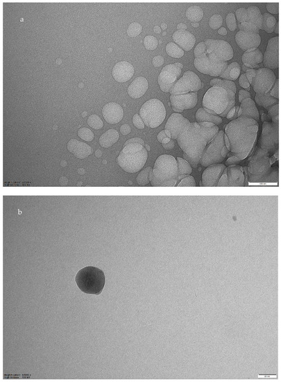 TEM analysis was performed on MIP03, and aggregates are visible in Figure 3a, with a size of about 2 μm. Isolated particles are also present, with sizes in the range 45–90 nm (Figure 3b).