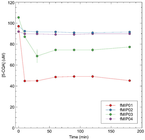 From rebinding tests, fMIP01 showed a good affinity for 5-CQA, binding 48 nmol after a few minutes of incubation and achieving the saturation point after 90 min of binding 70 nmol of 5-CQA. However, fNIP01 did not show any significant differences with respect to the binding affinity of fMIP01. This tendency could probably indicate that the interactions between functional monomers and templates occur in a very similar way, between both imprinted and non-imprinted polymers, with a prevalence for the non-specific interactions. Other molecularly imprinted polymers reported in the literature, using a mimic template, have shown similarly favorable performances between MIPs and NIPs, indicating that the imprinting binding sites play a minor role in selective target detection [32] (Figure 4 and Figure 5).