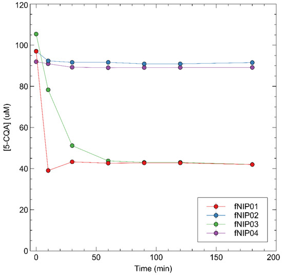 The selectivity was determined for only fMIP01 and fNIP01, which gave the best results in rebinding tests and was performed on a mixture of the analyte 5-CQA, together with the free hydroxycinnamic acids, such as caffeic and p-coumaric acid, as well as with caffeine. The tests were carried out treating a solution of 1 mg/mL of polymer with a mixture of 80 μM of each pure standard of 5-CQA, caffeic acid (CA), p-coumaric acid (pCoQA), and caffeine (CAF). The remaining standard concentrations in solution were measured by UHPLC after different incubation times.