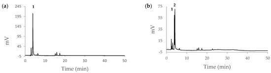 HPLC chromatograms of coffee extract (a) UV at 325 nm, peak 1: 5-CQA; (b) UV at 270 nm, peak 1: 5-CQA, peak 2: caffeine.