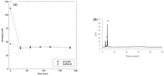 The filtrate was diluted 1:20 and analyzed by HPLC using a Thermo scientific Vanquish Dionex Softron instrument with a Kinetex C18 250 × 4.6 mm 5 µm 100 Å (Phenomenex) column, a column guard, a 100 µL loop, and a UV detector set at 325 nm (for 5-CQA) and 270 nm (for caffeine). The flow was set to 1 mL/min and injections were of 20 μL. The eluent was: solvent A H2O + 0.05% TFA and solvent B CH3CN + 0.05% TFA in a 85:15 ratio for the calibration curve of 5-CQA (Figure S1) and caffeine (Figure S2) (see Supplementary Material), while a gradient was used for the analysis of coffee extract (10 min 85% A and 15% B, from 15% B to 60% B in 20 min, from 60% B to 15% in 10 min, and 10 min 85% A and 15% B). Standard stock solutions were prepared in water in the range of concentration 50–250 µM for calibration curve of 5-CQA and caffeine. Each solution was analyzed by HPLC in triplicate, and the mean value of each solution was used for the calibration curve (Figures S1 and S2). The LOD and LOQ resulted in 6.4 μM and 19.5 μM, respectively. They were calculated according to the following equations:
