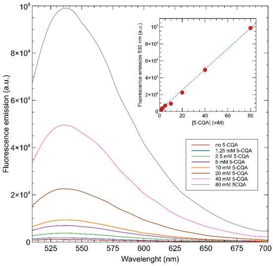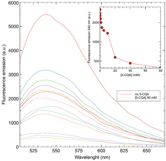 Once the polymer was immobilized, the fluorescence properties of the polymer were evaluated by carrying out titrations, in duplicate, with increasing concentrations between 78 μM and 80 mM of a standard solution of 5-CQA. The fluorescence emission of the fMIP01 was measured at 540 nm when excited at 480 nm, before and after incubation, for 90 min. The fMIP01 fluorescence resulted in a correlated quenching in a range from 156 μM to 40 mM of the analyte (Figure 12).