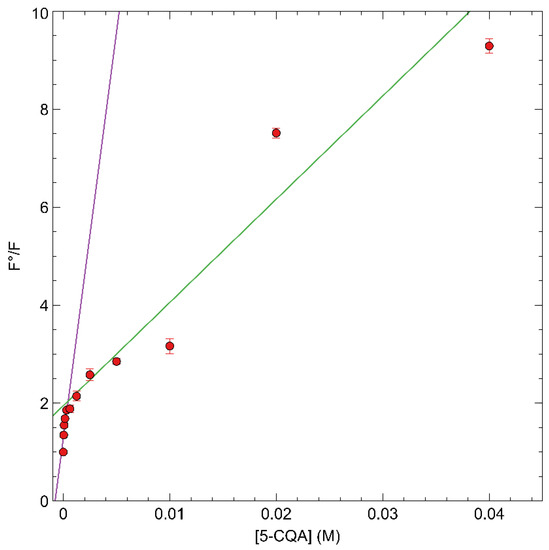 The Stern-Volmer plot obtained with fMIP01 is reported in Figure 10, where a bimodal quenching behavior can be noticed with a first, higher slope, linear region at low concentrations of 5-CQA and a second, lower slope, linear region at higher 5-CQA concentrations. This behavior can be an indication of the presence of non-homogeneous binding sites inside the polymers with different affinity for 5-CQA.