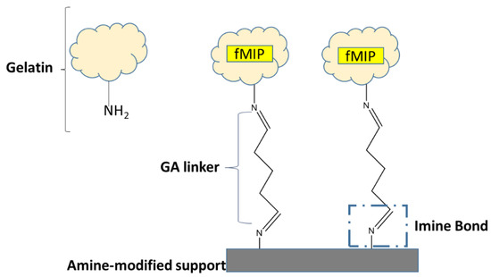 The entrapment has been carried out using a suspension of 100 μg/mL of fMIP01 in water:DMSO (9:1) and a solution of 20 mg/mL of gelatin, which were mixed together in a ratio of 1:1 and immobilized on a poly-lysine glass support using glutaraldehyde (GA) as a bifunctional crosslinking agent (Figure 11).