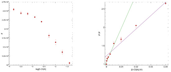 Preliminary calibration curve of immobilized MIP01 with 5-CQA (left), Stern-Volmer plots of immobilized fMIP01 for 5-CQA (right, green line: regression of low concentration data; magenta line: regression of high concentration data).