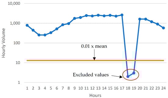 The available data, as shown in Figure 2, was screened for irregularities. Firstly, all daily volumes for a particular day of the week in a particular month were checked to ensure that they lay within 20% of their mean value. This resulted in the identification of some days having inconsistent volumes. The data revealed numerous hourly volumes to be missing (replaced by NA). It was also observed that some inconsistent hourly volumes were recorded, such as an hourly volume of 2 recorded while the mean hourly volume for that day was above 1000. Consequently, a high-pass filter was implemented such that all hourly volumes less than 1% of the mean hourly volume for that day were replaced with “NA”, as demonstrated by data from just one such day in Figure 3. Hence, not only complete days were missing, but hourly volumes from within available days were also missing. The distribution of data after cleaning is shown in Figure 4.