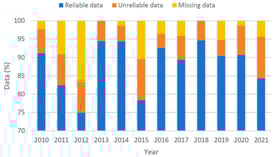 Despite being designed to collect traffic volume data continuously, the collection devices could display varying unreactive periods. Hence, the collection agency defined the collected data in terms of data availability and data reliability. Data availability refers to the percentage of available data within the recorded duration, whereas data reliability indicates the percentage of usable data within the available data.