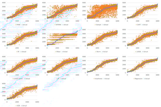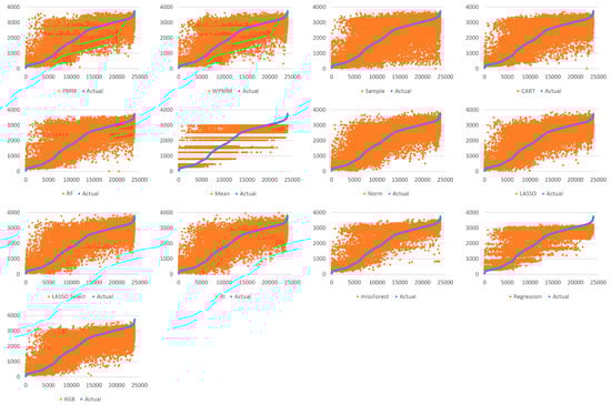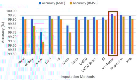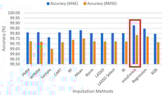 Figure 5 demonstrates the spread of predicted values by each method for 25% missing data. Each graph shows the actual values sorted in ascending order and their respective predicted values as obtained using several methods. It is evident that taking random samples for data imputation results in a considerable deviation from the true values. The second worst case can be observed for mean value imputation. Another observation is that predictive mean matching works better than weighted predictive mean matching. All the other methods show a mostly similar extent of spread, with missForest showing the most compact picture in the case of 25% missing data. For 100% missing data, similar graphs are provided in Figure 6. Due to the increased complexity of this task, the figure shows a significant deviation from the actual values for all methods. It is difficult to identify the best-performing algorithm, although missForest shows a slightly compact trend. To investigate further, imputation accuracies were calculated, as shown in Figure 7 and Figure 8. It is evident from the figures that missForest outperforms all other methods in both testing scenarios, closely followed by the random forest regression method. Furthermore, the accuracy achieved for 100% missing data by missForest is slightly lower than that achieved for 25% missing data, with an accuracy drop of 0.08% in terms of MAE and 0.16% in terms of RMSE. One can also deduce that although missForest provides the highest accuracy, the accuracy differences with other methods are not very substantial. Hence, other methods can also be utilized with a slight decrease in imputation accuracy.