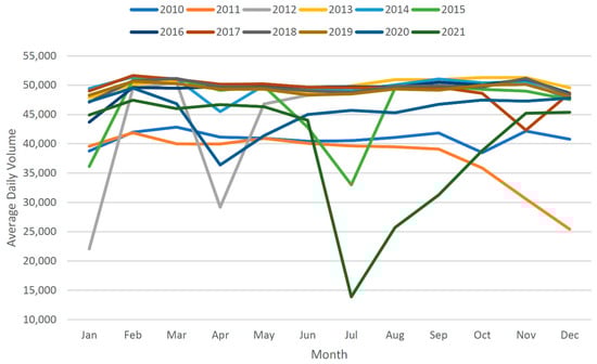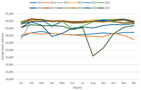 Table 2 gives the AADT calculations for before and after data imputation. It can be observed that AADT values differ more in years when there are more missing. Moreover, the completion of data with the assistance of imputation always results in a relatively higher AADT value. The effectiveness of data completion can be checked by plotting the average daily volumes before and after imputation, as performed in Figure 10 and Figure 11. It is evident from Figure 10 that the original data demonstrate substantial variations, whereas the traffic should have shown relatively similar trends over the years. However, the plot derived from imputed data in Figure 11 shows relatively better traffic patterns.