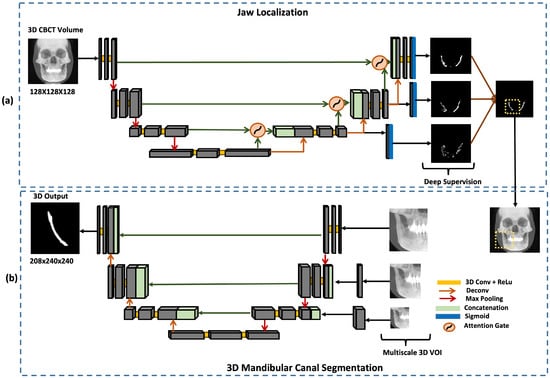- Du, G.; Tian, X.; Song, Y. Mandibular Canal Segmentation From CBCT Image Using 3D Convolutional Neural Network With scSE Attention. IEEE Access 2022, 10, 111272–111283. [Google Scholar] [CrossRef]