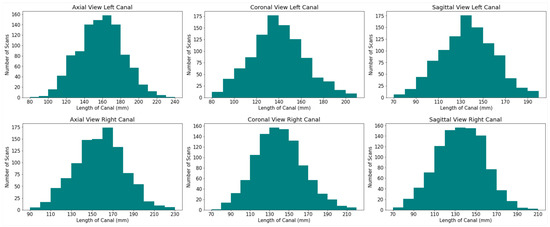 The size of the mandibular canal was analyzed statistically, as shown in the Figure 5. It is visible that both the right and left canals vary in size. Thus, to ensure that the model’s performance remains similar for all sizes of canal VOIs, Residual UNet architecture with multi-scale inputs was utilized to perform the task of 3D segmentation of the mandibular canal, as shown in (b) in Figure 4. The sizes of three inputs are kept as 208 × 240 × 240, 144 × 176 × 176 and 108 × 144 × 144. The benefit of multi-scale input is that it caters to all the different available sizes of the mandibular canal and hence reduces the segmentation error around the boundary. This structure enables the encoder of the network to extract features better. The output was binarized by applying a thresholding of 0.5.
