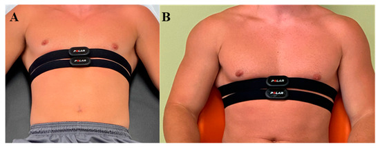 Two separate Polar H10 HRMs were placed over the xiphoid process of each participant superiorly and inferiorly to each other, and R–R interval data were simultaneously collected in both the supine (Figure 1A) and seated (Figure 1B) positions according to recommendations in the literature [27]. Specifically, after a five-minute stabilization period, 5 min of R–R interval data were collected in each position with the participant quietly resting. Controls for breathing rate were not performed by the researchers in the current study, as our procedure was consistent with field-based approaches to collecting HRV data [12,17,18].