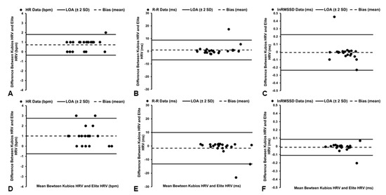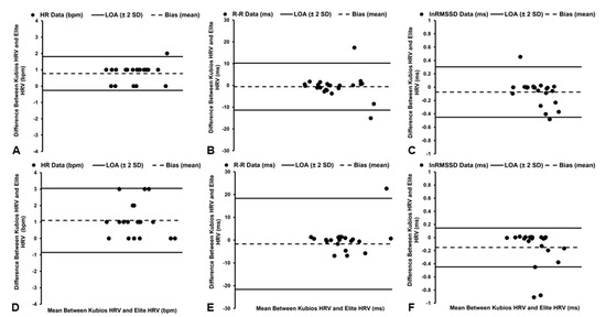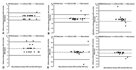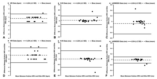 Bland–Altman plots demonstrating the mean bias and limits of agreement (LoA) of heart rate (HR, A), R–R interval (B), and natural log of root mean square of successive differences (lnRMSSD, C) data in the supine position and the mean bias and limits of agreement (LoA) of HR (D), R–R interval (E), and lnRMSSD (F) data in seated position when utilizing Very Low artifact-correction level.