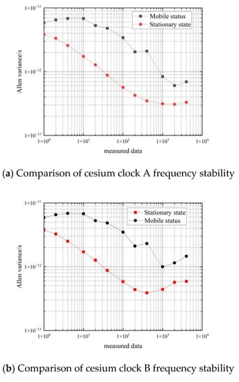 Figure 12 shows a comparison of the frequency stability of the cesium clock in the stationary and moving states.