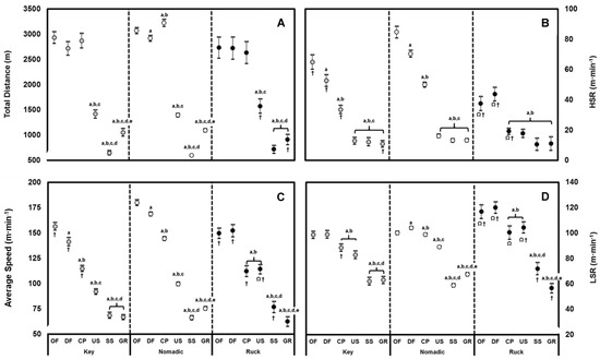 Positional analysis of (A) total distance (m), (B) average speed (m·min−1), (C) high-speed running (m·min−1) and (D) low-speed running (m·min−1) during the phases of professional Australian Football match-play. Values are mean ± 95% CI. Key: OF = Offence, DF = Defence, CP = Contested Play, US = Umpire Stoppage, SS = Set Shot, GR = Goal Reset. a Significantly different to OF, b Significantly different to DF, c Significantly different to CP, d Significantly different to US, e Significantly different to SS. Ω = Significantly different to key position players, † = significantly different to nomadic players (p < 0.05).