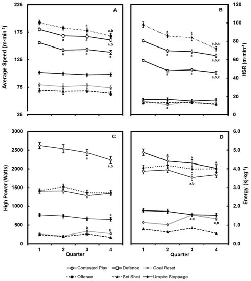 Match analysis by quarter for (A) average speed (m·min−1), (B) high-speed running (m·min−1), (C) high power (watts) and (D) energy expenditure (kj·kg−1) during the phases of professional Australian Football match-play. Values are mean ± 95% CI. a significantly different to quarter 1, b significantly different to quarter 2, c significantly different to quarter 3.