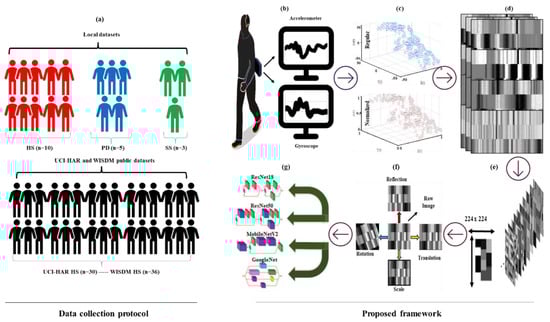 Data collection protocol and proposed framework: (a) Dataset illustration. The flow of the proposed HAR methodology with data augmentation and CNN architectures: (b) IMU data acquisition, (c) data normalization, (d) numerical to image conversion, (e) resizing, (f) data augmentation, (g) CNN classification.