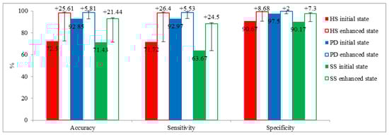 Figure 2 presents the average performances of all CNN architectures from Table 9, Table 11, and Table 13. Sensitivity and specificity values were normalized to 0–100 to present comparable results against accuracy. Comparing initial and enhanced results considering the overall performance of all CNN architectures in the local datasets reveals that the largest improvement in terms of accuracy is observed in HS with 25.6%, followed by SS with 21.4% and PD with 5.8%, as seen in Figure 2. Comparing accuracy, sensitivity, and specificity reveals that data augmentation had the largest improvement in sensitivity at 18.81%, followed by the accuracy at 17.62% and relatively small improvements in specificity at 5.99%. This finding could be associated with the nature of the limited and imbalanced local datasets. In the initial state, the number of true positive (TP) and true negative (TN) in the classification were relatively low. After data augmentation, models experienced better performance in predicting positive classes compared to negative classes. This resulted in a larger increase in TP compared to TN. Consequently, improvements in sensitivity were found to be significantly larger than specificity, Equations (4)–(6).