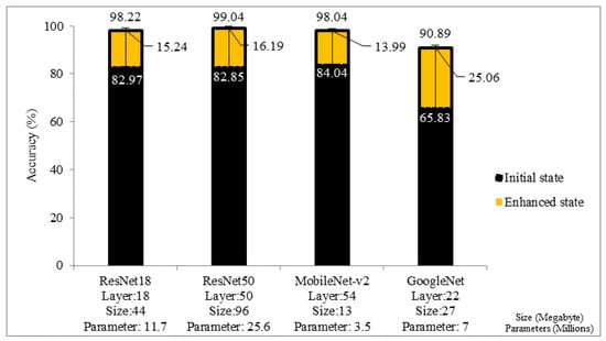 Comparison of CNN architectures in terms of accuracy in initial and enhanced status in the local datasets (HS-SS-PD combined).