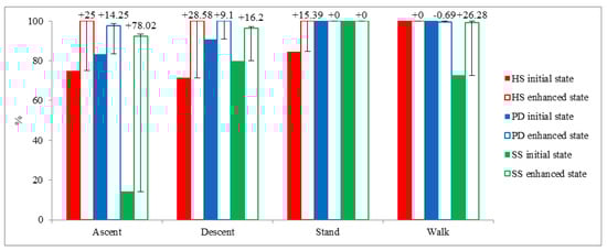 We tested the proposed approach (initial state and enhanced state) on local datasets of HS, PD, and SS groups. In the initial state, in terms of accuracy, CNN architectures provide higher performances in the PD dataset compared to HS and SS. This could be associated with the fact that the PD dataset is more balanced than SS and larger than both HS and SS. In addition, majority classes (walking and standing) are better recognized than minority classes (ascent and descent) in the PD dataset. When the sizes of the datasets were artificially increased with data augmentation techniques in the enhanced state, improvements were achieved in all CNN architectures. It is important to highlight that data augmentation has no impact on the balance of a dataset because each class is enhanced at the same rate.