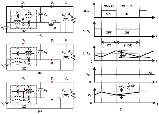 (a) Proposed high step-up DC–DC converter (LQZC). (b) Mode1 operation. (c) Mode2 operation [24]. (d) Key waveforms. Reprinted/adapted with permission from Ref. [24]. Copyright 2022, IEICE.
