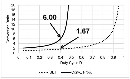 Figure 2 shows the CR of the BBC and the proposed converter. To eliminate narrow pulse-width control difficulty, the conventional converter [17] and the proposed converter [24] are designed to operate in a range from 0 to 0.5 of D, unlike BBT. The CR of Conv. [17] and Prop. [24] is obtained as 6.00 but that of BBT [7] becomes only 1.67 at D = 0.4.