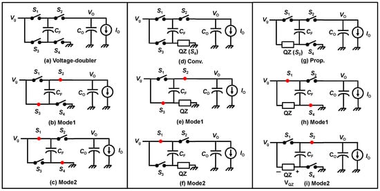 Comparison of converters: (a) voltage doubler, (b) Mode1 of voltage doubler, (c) Mode2 of voltage doubler, (d) Conv., (e) Mode1 of Conv., (f) Mode2 of Conv., (g) Prop., (h) Mode1 of Prop., and (i) Mode2 of the Prop. Reprinted/adapted with permission from Ref. [24]. Copyright 2022, IEICE.