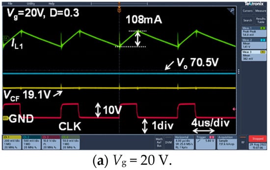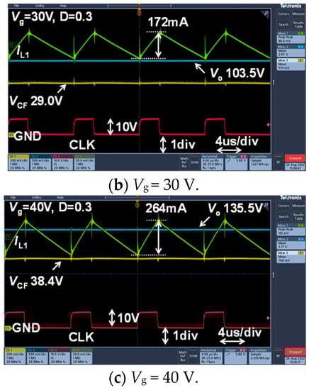 Figure 6 shows the steady-state measurement waveforms of IL1, Vo, VCF, and CLK when D = 0.3 and Ro = 500 Ω, and set to Vg = 20 V, 30 V, and 40 V, respectively.
