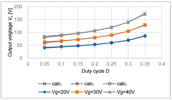 Figure 7 shows the relationship between the measured output voltage Vo and duty cycle D drawn together with the calculated gain by the dotted lines. The duty cycle D changed from 0.05 to 0.35 for input voltage Vg = 20 V, 30 V, and 40 V, respectively, on Ro = 500 Ω. The measurement results agree well with the calculated results. When the duty cycle D is small, the output voltage Vo is slightly low because of the forward voltage VF of D1.