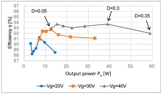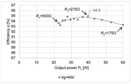 Figure 8 depicts the relationship between the output power Po and the efficiency η using the data of Figure 7. Figure 9 shows the efficiency versus the output power Po at Vg = 40 V and D = 0.2 when Ro varies from 500 Ω to 175 Ω by 25 Ω steps. The peak efficiency 94.9 % is obtained. Table 3 summarizes the performance comparison of Conv. [17] and this work.