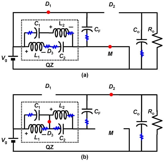 Figure 1a shows the proposed converter. The surrounded dot-line is a QZ network. It operates in two modes, Mode1 and Mode2.