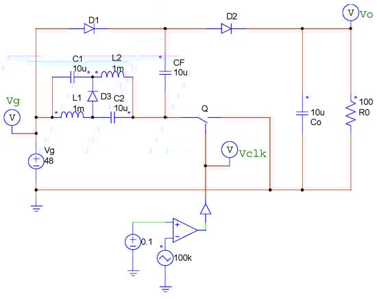 The proposed converter provides the reduction in voltage stress for the flying capacitor CF. The voltage stress of elements is shown in Table 1. In a conventional converter, the terminals of CF are applied by Vo and Vg as shown in Figure 3e. Using Equation (10), the terminal voltage across CF becomes: