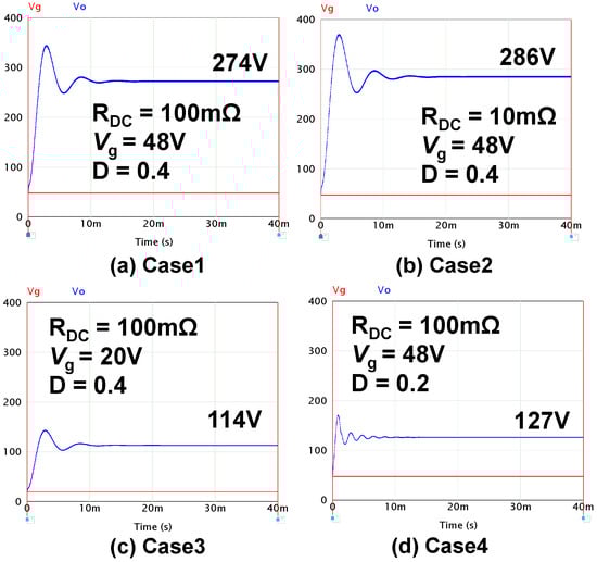 To verify Equation (19), the output voltage Vo was checked by the PSIM [30] simulator when conditions changed. In the simulator circuit, the output resistance Ro is set to 100Ω, and RDC are added to L1 and L2, respectively, in Figure 11. In this situation, four cases are tested. Figure 12 shows the simulation results of output voltage Vo in four cases. The blue line is output voltage Vo, and the red line is input voltage Vg. Table 4 shows the results of calculations and the simulation results.