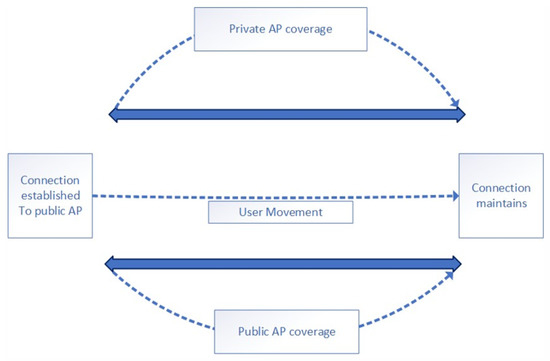 In recent research, Kim et al. [26] demonstrated that if a user is connected to an AP (access point), the user keeps the connectivity unless the AP goes out of range and only then connects to the new best available AP. In Figure 1, a user is connected to a public AP, and even when the user arrives home, a better connection is available. The user stays connected to the less reliable/slow public network unless the user himself shifts to the better network or the public AP goes out of range. In a similar analogy, a set of two users, despite having a small Euclidean distance between them, might be connected to a different set of APs, and have different connectivity routes. This gives rise to the motivation that IP-based similarity has been used rather than a Euclidean distance-based user’s mobility similarity analysis.