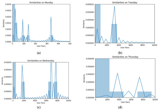 Similarity analysis during different days, (a) On Monday, (b) On Tuesday, (c) On Wednesday, and (d) On Thursday. Similarity shows that these users are found on the same location during the same time frame.