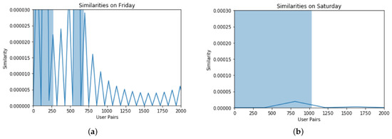 Similarity analysis during different days, (a) On Friday, and (b) On Saturday. Similarity shows that these users are found on the same location during the same time frame.